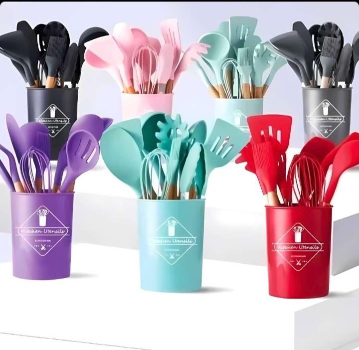 ✅طقم معالق سيلكون حراري 12قطعة 😍✅مسكة يد خشب زان 👌✅متوفر بعدة الوان زوق❤️✅ الالوان المتوفره ✅ اسود * اخضر * رمادي *