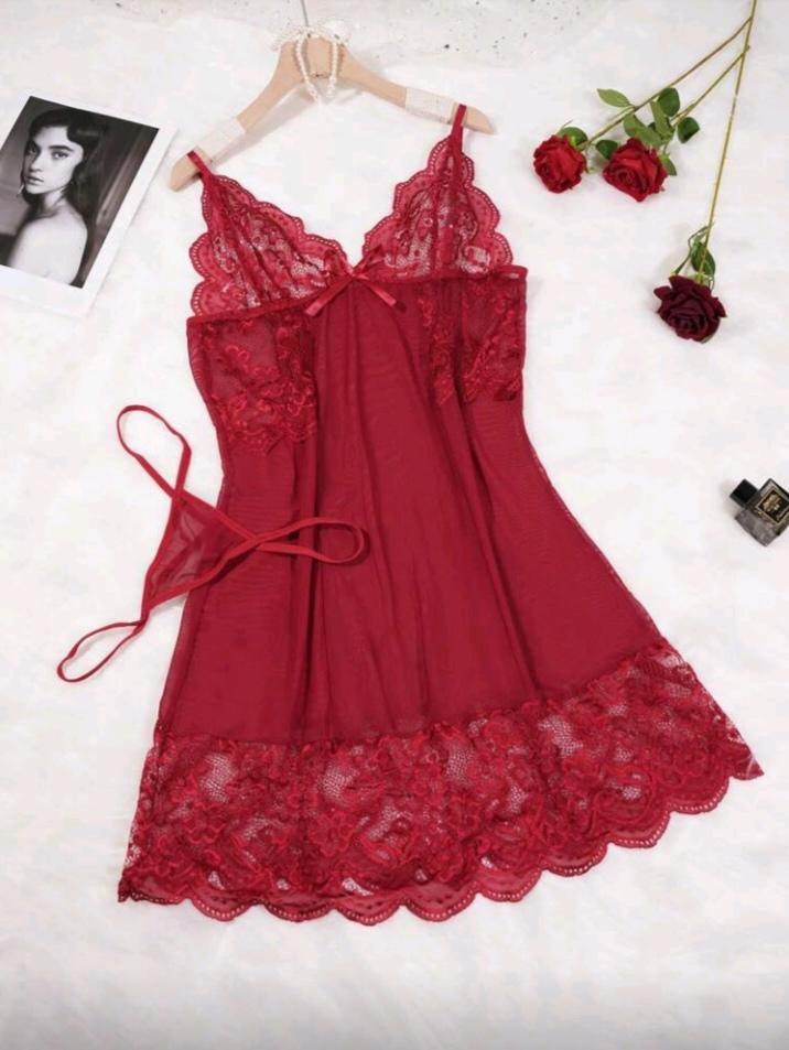 مجموعة نوم سكسية للنساء تتكون من 2 قطعة، قميص كامي مزين بالشريط الأحمر الشفاف والشبكة والفيونكة