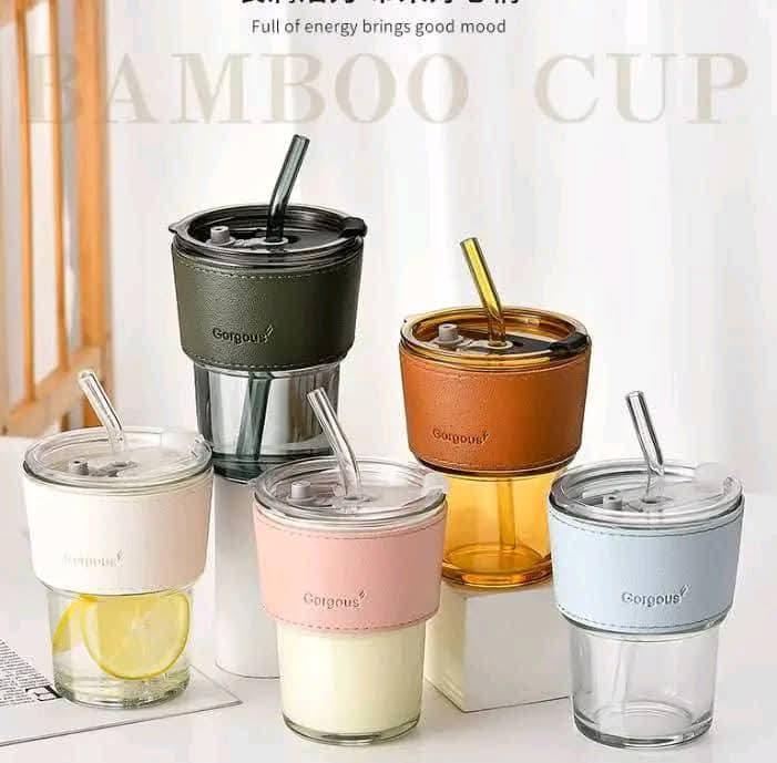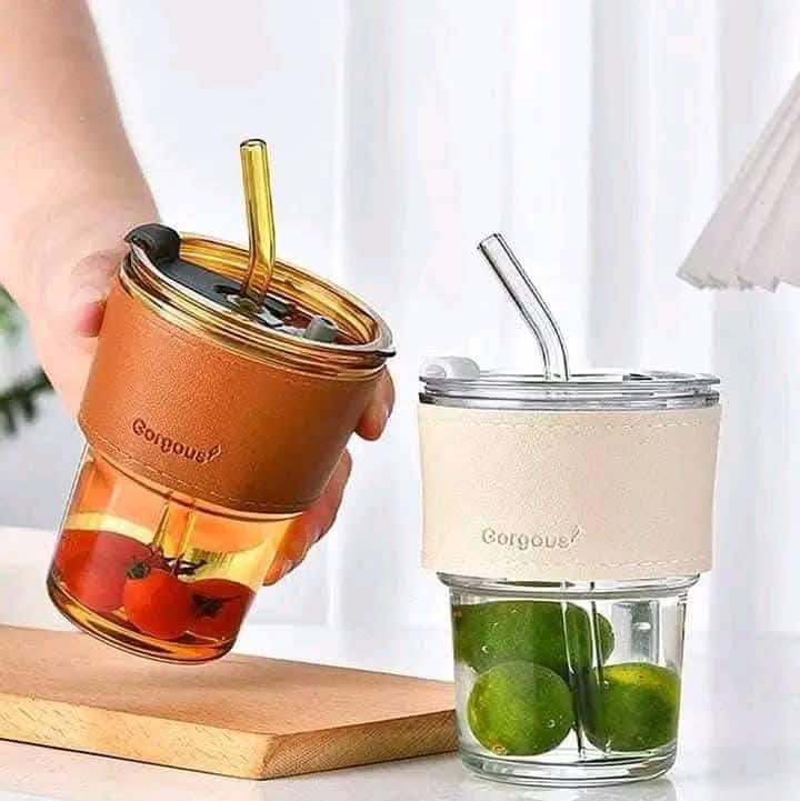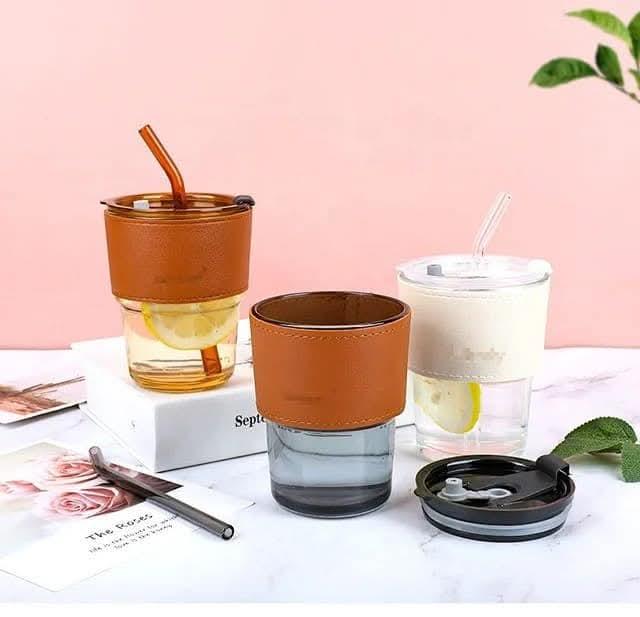 كوب زجاجي عسلي انيق جدا مع مصاصه زجاجيه وشريط دائري مصنوع من الجلد