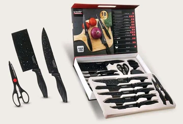 _تشتمل المجموعة على أدوات متنوعة مثل سكاكين بأحجام مختلفة، مقص مطبخ، مقشرة، وأداة تقطيع بيتزا.